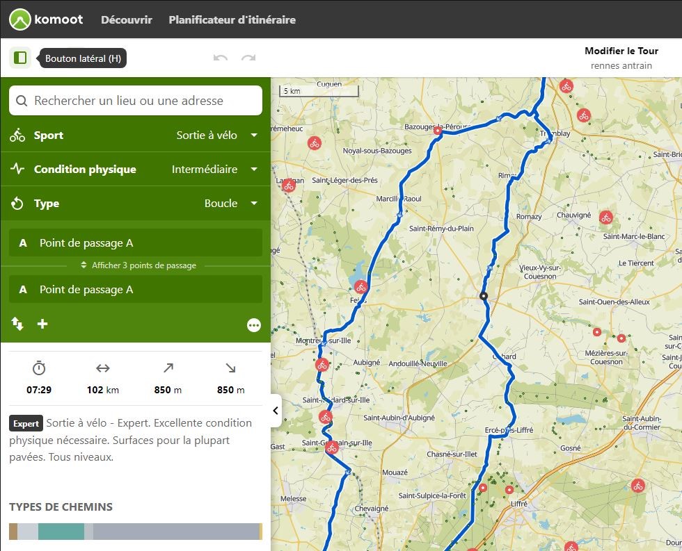 Pour tracer vos itinéraires à l'écran, BRouter suit parfaitement les voies cyclables. Importation facile du fichier GPX dans Komoot par exemple.